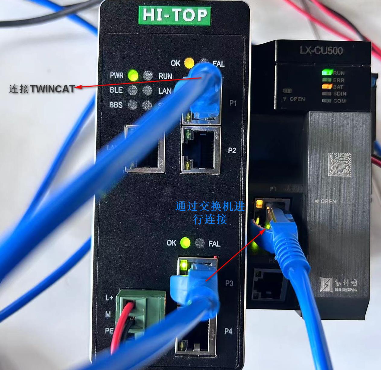 2. 连接网关P1口到TWINCAT的网口,连接P3口到LX-CU500的P1网口
