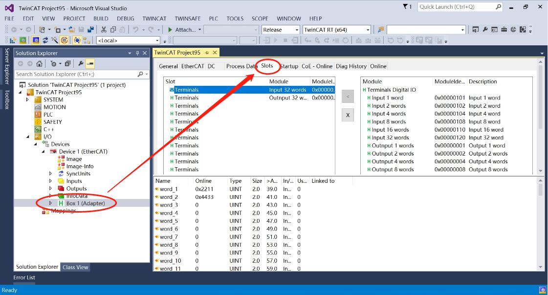 添加后的从站,如下图所示的 Box 1。点击左侧项目树中的Box 1,在右侧的主视图中,点击Slots,可以看到网关配置输入输出数据的页面。
