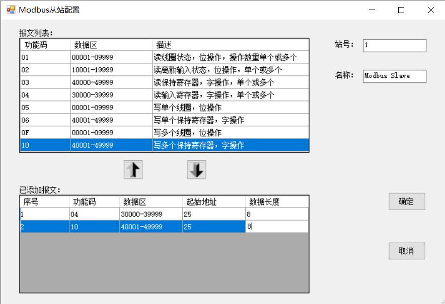 双击“Modbus Slave”配置要读的寄存器,本文中添加“04 读输入寄存器”,起始地址为需要参考TCP使用说明,长度8,对应plc里下载的参数。