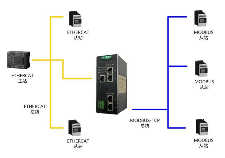 HT3S-ECS-MTP是一款EtherCAT从站功能的通讯网关。该产品主要功能是将各种Modbus TCP设备接入到EtherCAT网络中。本网关连接到EtherCAT总线中作为从站使用,连接到Modbus TCP总线中作为主站(客户端)或从站(服务器)使用。