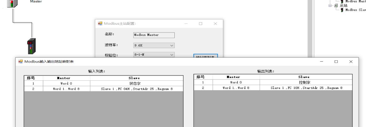 双击“Modbus Master”,然后点击“地址映射表”,查看所有地址寄存器。这里除了从站的寄存器之外,还有一个状态字和控制字,因此,输入有9个字,输出有9个字。如下图所示: