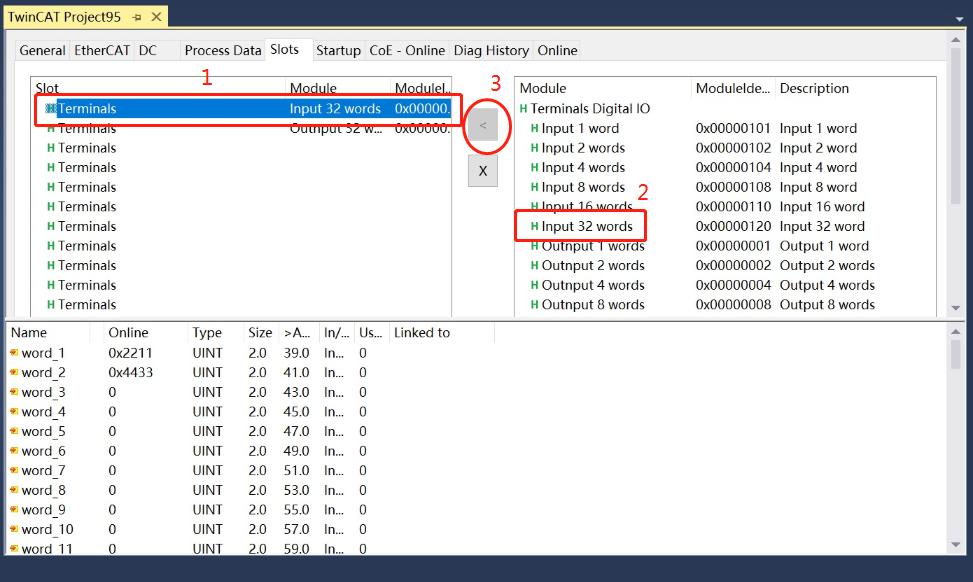 如下图所示,在Slot列表中,一共可以添加16条配置信息。右侧Module列表的每一条配置选项,都可以添加到Slot中。按照下图1、2、3的操作顺序,可以将Module添加到Slot中。