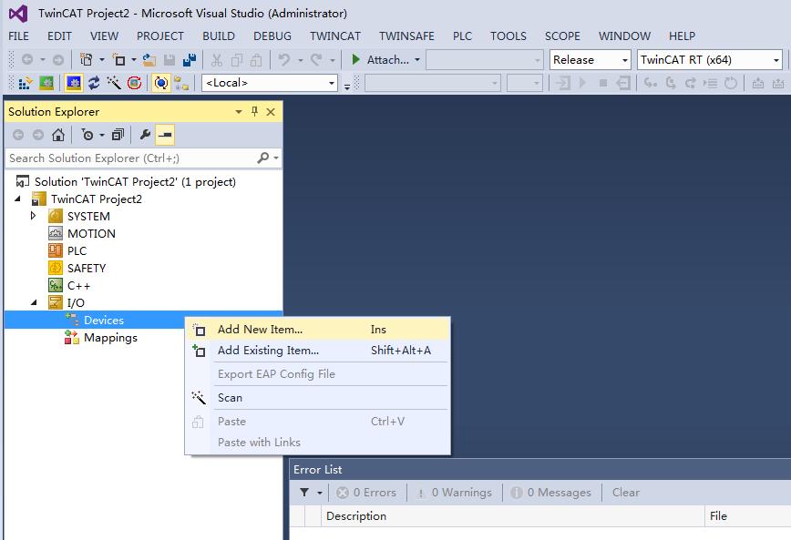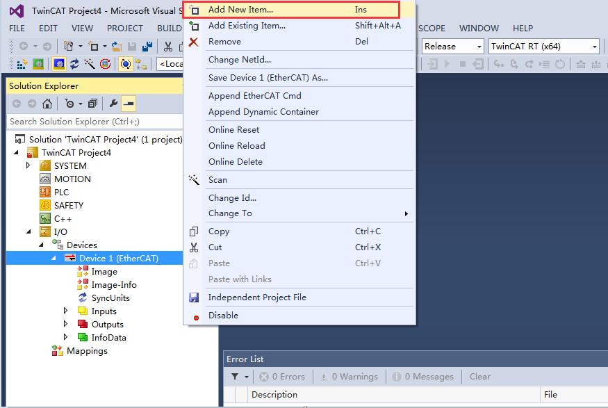 新建工程后,在下图中Device的位置,点击鼠标右键 Add New Item,添加EtherCAT主站。