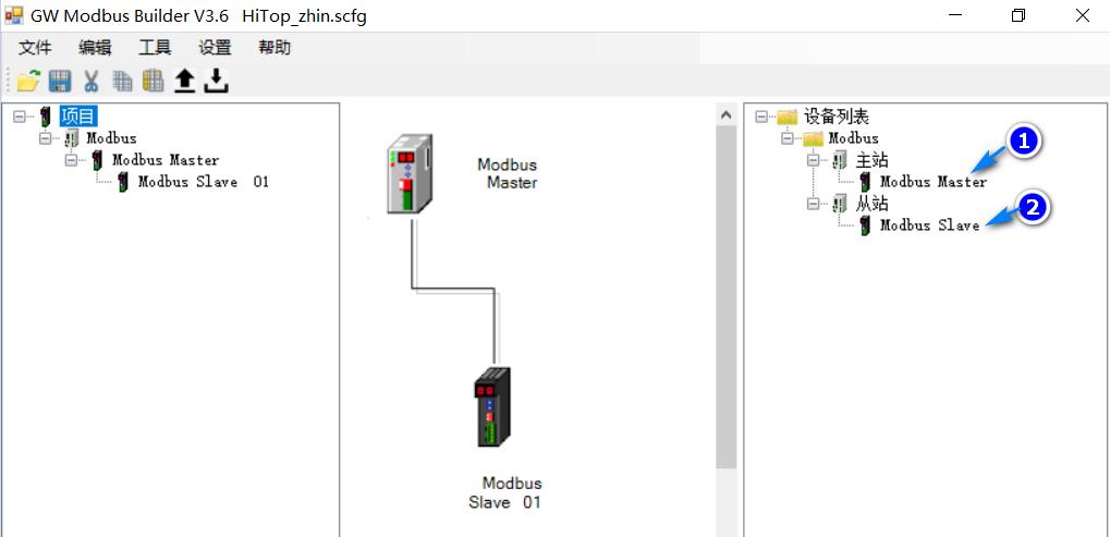 然后分别双击右侧的“Modbus Master”和“Modbus Slave”添加Modbus主站(客户端)和Modbus从站(服务器),如下图所示: