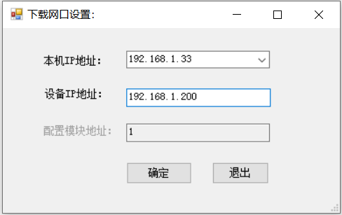 在弹出的窗口中选择本机连接网关P3口的网卡的地址,并输入网关Modbus口的地址点击确认按钮。注意,计算机网卡地址和网关地址要在同一网段。
