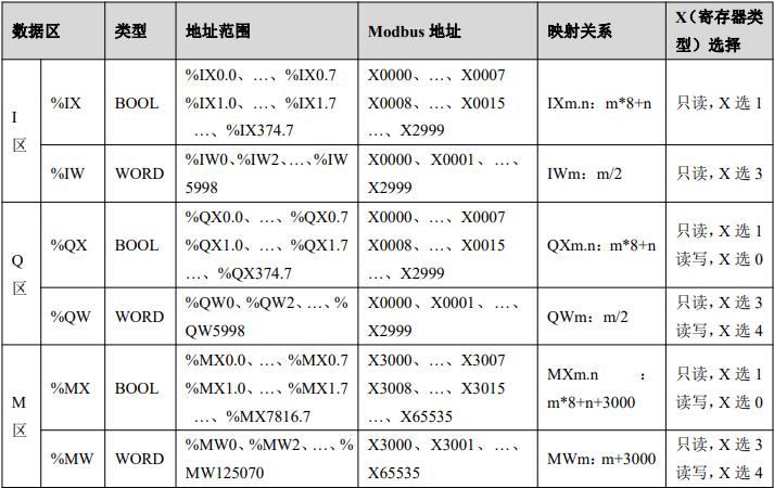 和利时LX-CU500PLC支持Modbus TCP协议,在其MODBUS TCP手册中可以看到它参数对应的Modbus TCP地址表如下: