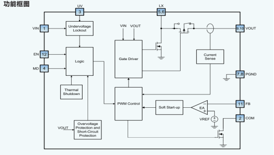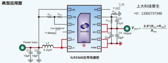 轻负载工作时,MD管脚可选自动PSM工作模式或强制PWM工作模式