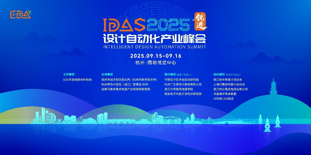 为进一步凝聚EDA产业力量,加速EDA技术突破和产业推广,推动生态多元化发展,由EDA开放创新合作机制主办,杭州市经济和信息化局(杭州市数字经济局)、杭州高新开发区(滨江)管委会 政府及国家高新区集成电路产业协同创新网络支持,中国电子技术标准化研究院、杭州广立微电子股份有限公司、浙江大学集成电路学院、西安电子科技大学杭州研究院承办,浙江省半导体行业协会、上海市集成电路行业协会、浙江创芯集成电路有限公司、求是缘半导体联盟及半导体CAD联盟协办的第三届设计自动化产业峰会IDAS 2025(Intelligent Design Automation Summit 2025)将于2025年9月15日-16日在杭州·国际博览中心举行,报名通道现已正式开启。