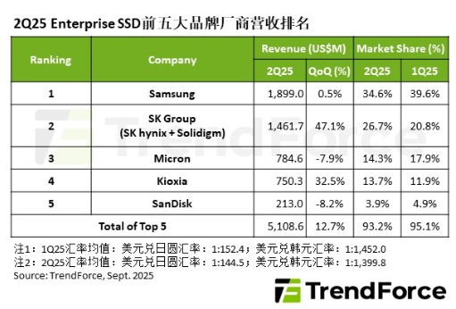2025年第二季NVIDIA(英伟达) Blackwell平台规模化出货,以及北美CSP业者持续扩大布局General Server(通用型服务器),均带动Enterprise SSD(企业级固态硬盘)需求显著成长,前五大品牌厂营收合计逾51亿美元,季增12.7%。然而,DDR4的短缺和主控IC载板的交期延长,导致Enterprise SSD普遍供不应求,也牵动各厂商第二季的市占比例和营收表现。