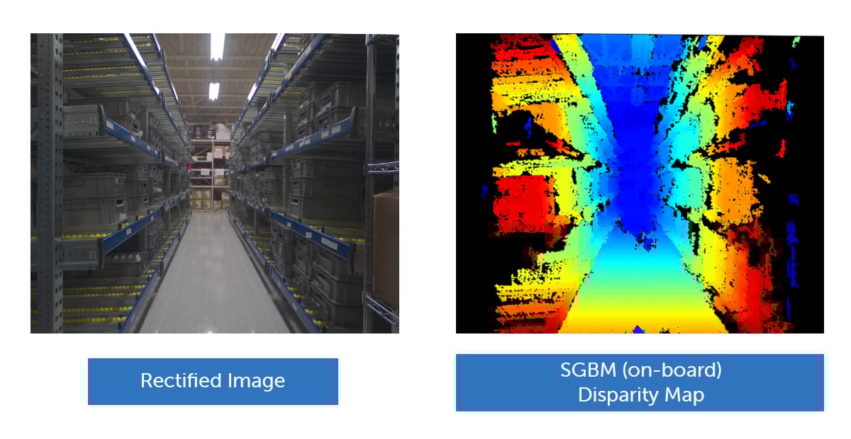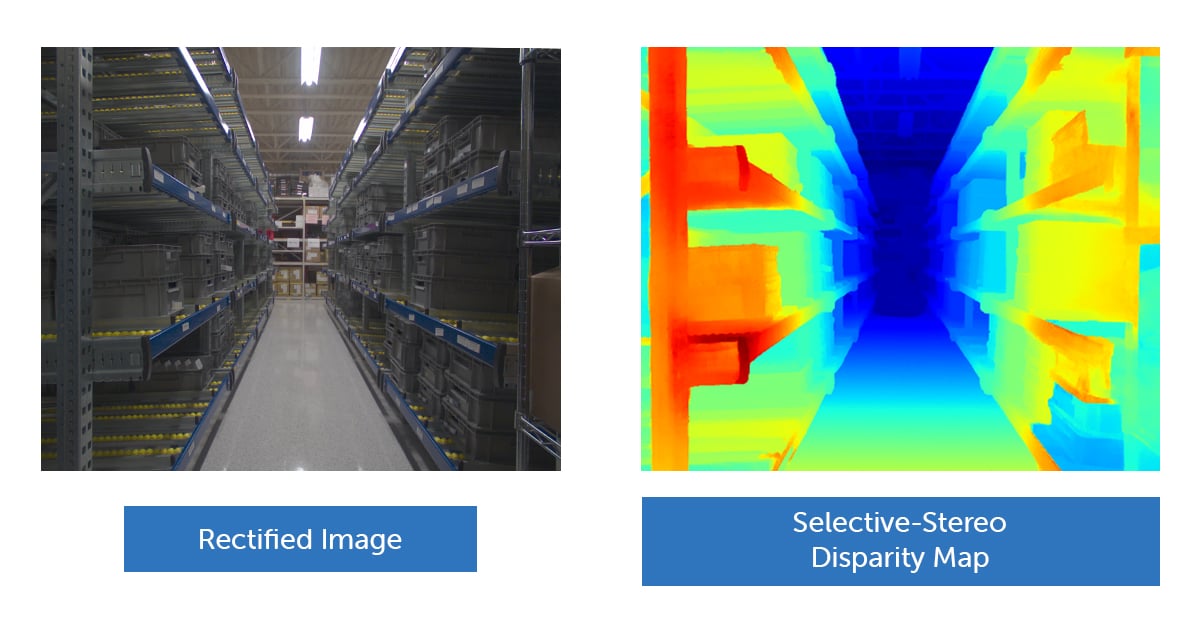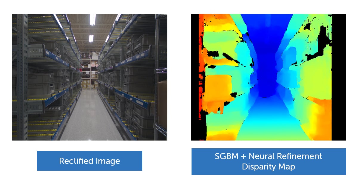在同一个仓库场景中,我们通过将从内置视差引擎获得的输出与左侧校正图像一起输入到神经视差细化模型中,以优化视差。结果如下所示: