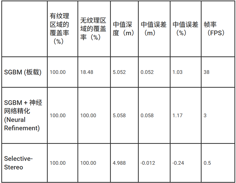 - 平衡覆盖与延迟:将神经视差细化与内置SGBM异步结合,增强覆盖范围。