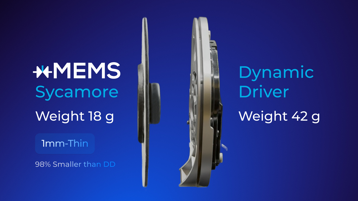 取代传统的40-50mm动圈驱动单元,Sycamore MEMS扬声器提供固态替代方案,体积缩小98%(仅85mm³,相比50mm驱动单元的约4,000mm³),重量仅150毫克。尽管体积微小,Sycamore仍可实现全频段高保真音频性能,并且仅需1cc后腔空间,从而释放耳罩内部更多空间,可容纳更大容量电池、先进PCB和更纤薄的工业设计。
