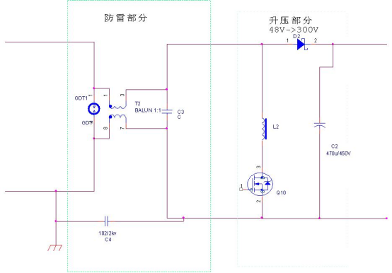 DC/DC升压环节通常都是靠一个完整的电路实现从低压例如48V升高到约300V。所以,一般不需要对升压后的电压做检测;如果有需要,在前级增加防雷和浪涌保护,以防止后端元件损坏,导致设备异常,如下的电路的防雷部分即可满足抗2000V 浪涌/EFT等的测试。其电路见下: