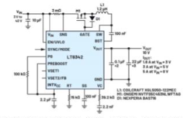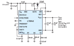 LT8342 集成了40 V、9 A电源开关,输出电压可编程,最高可达36 V。它还支持2.8 V至40 V的宽输入电压范围;针对VIN ≥ VOUT的情况,它支持PassThru™(直通)工作模式。在突发工作模式(Burst Mode®)下,该集成电路(IC)的VIN引脚静态电流非常低。它可以编程为或同步至最高3 MHz,因此外部元件和核心解决方案的尺寸得以减小。该器件采用Silent Switcher®架构,在实现高效率的同时有效减少了电磁干扰(EMI)。它采用紧凑的4 mm × 4 mm LQFN封装。