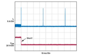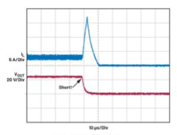 该转换器具有输出短路保护机制,可防止其在短路事件中受损。外部检测电阻和N沟道FET(与转换器输入串联)可监控电流,并在必要时断开输入。当流过检测电阻的电流上升到足够高的程度,以至触发内部比较器的电压阈值时,IC会将把GATE引脚拉至地,从而关断外部FET并限制短路电感电流。图5和图6中的波形展示了输出端发生短路事件时IC的典型响应。