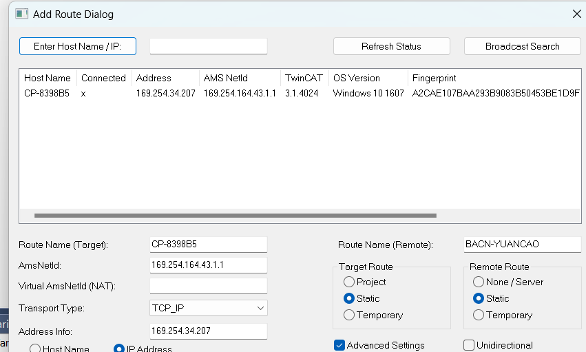 (6)然后可以选择已经和控制器连接的网卡适配器,当点击Broadcast Search之后,可以查看是否有搜索到目标控制器,并显示控制器相关信息:选择搜索到目标控制器之后选择添加方式(Host Name或IP Address),并点击对话框右下角的Add Route, 如图7-2: