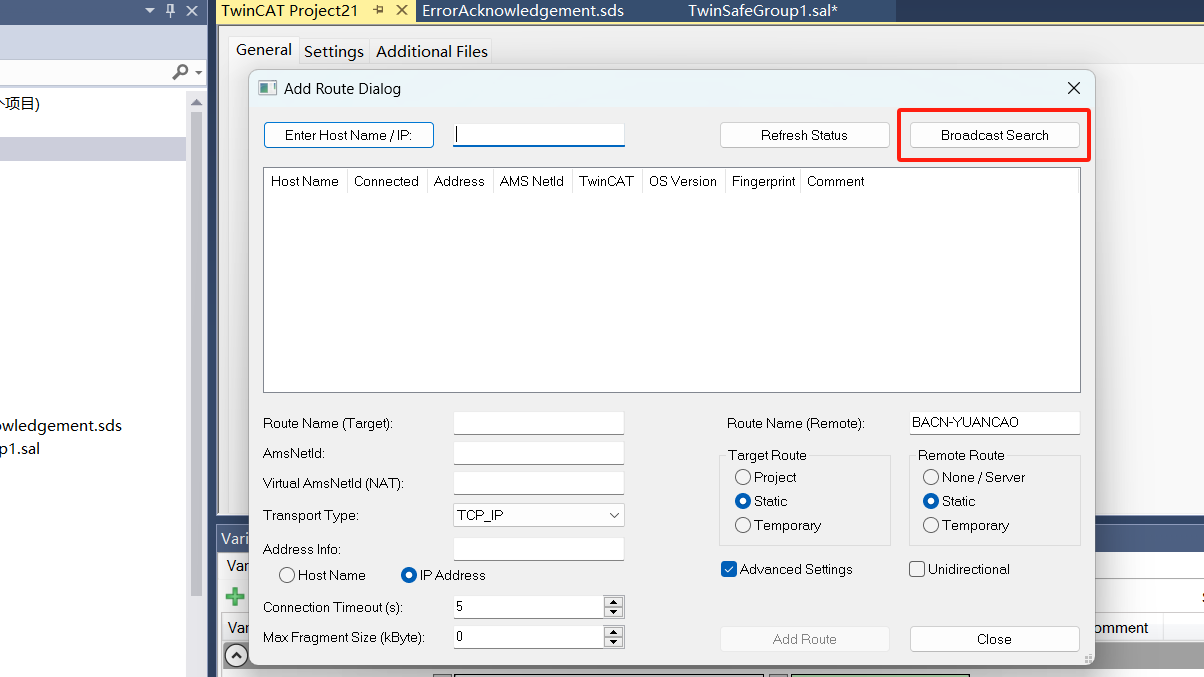 (5)出现Add Route 对话框以后,勾选Advanced Setting, 并点击Broadcast Search 进行广播搜索, 如图7-1: