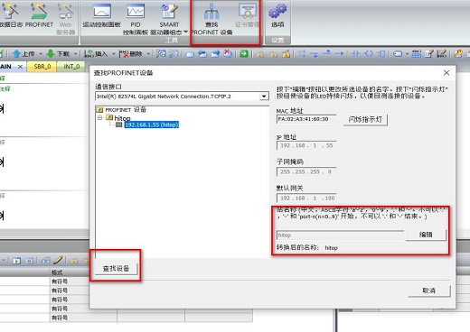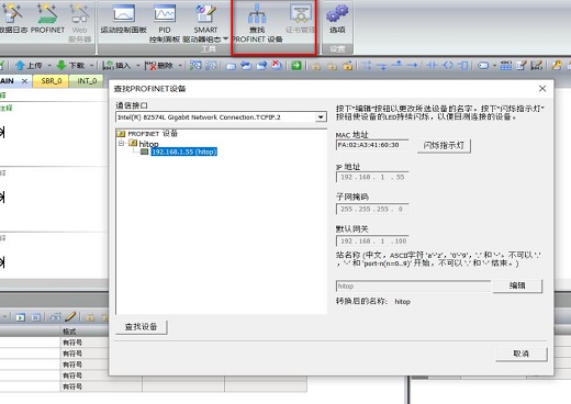 点击工具——查找PROFINET设备,在弹出的界面中选择自己的所用的网卡,点击查找设备。