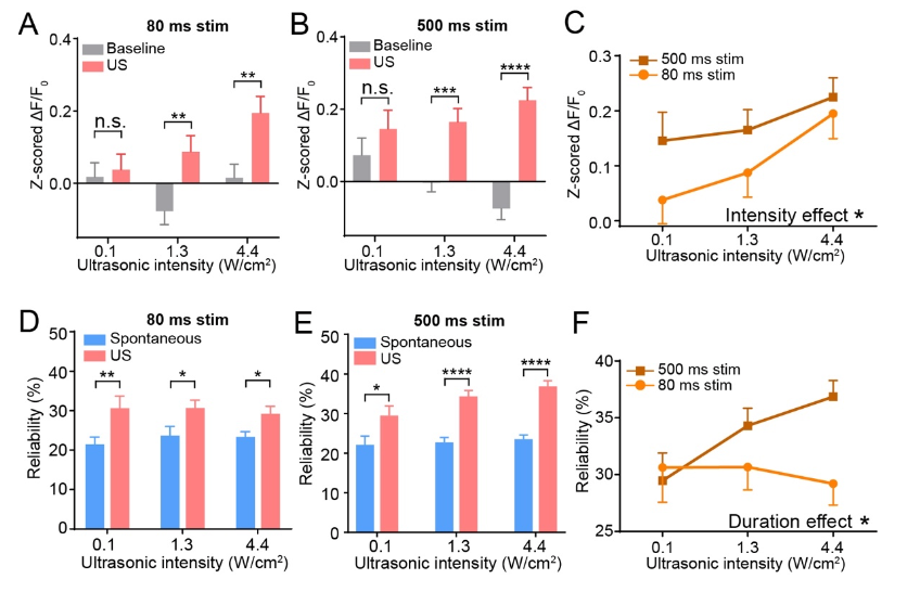 实验结果:对树突群体钙信号的定量分析显示,超声刺激下浦肯野细胞神经活动的整体幅度随刺激持续时长和超声强度的上升而增加,其中1.3W/cm2、4.4W/cm2强度的超声在80毫秒(图A)和500毫秒(图B)的刺激时长下均能显著增强神经活动的幅度。双因素方差分析的结果表明,超声的声强是影响浦肯野细胞树突整体神经活动幅度的显著因素(图C)。除了树突整体的神经活动外,我们对被超声激活的树突在自发活动和超声刺激期间的钙信号事件发生率进行了统计分析。比较结果显示,在这些树突中,钙信号事件的发生率在超声刺激期间均显著高于自发活动水平(图D和E)。对不同刺激参数下超声刺激引起的钙信号事件发生率的比较结果显示,刺激时长是影响超声神经调控浦肯野细胞稳定性的显著因素(图F)。