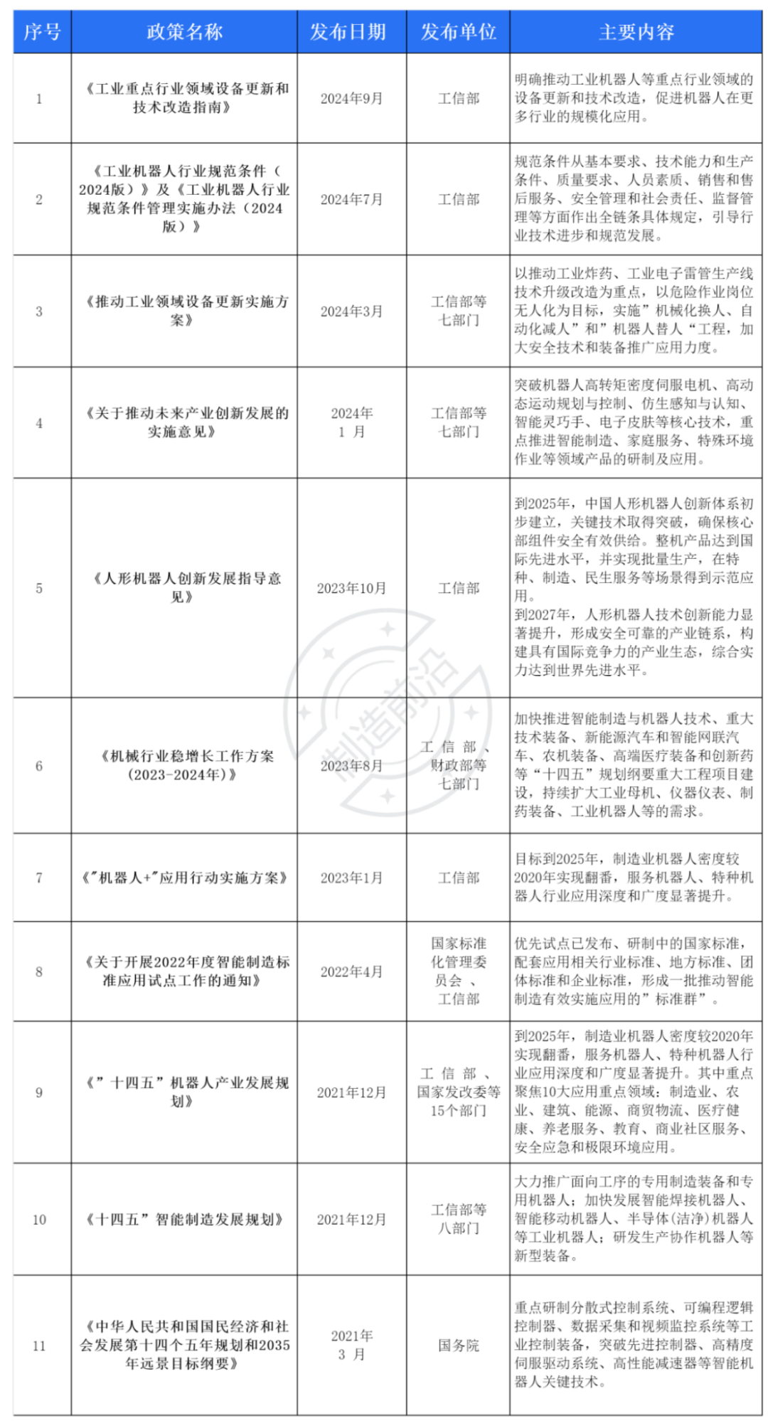 目前,中国工业机器人已经渗透到各个产业,政府及相关部门陆续出台了一系列政策及规范性文件,融入智能制造、人工智能、数字经济、新型基础设施建设等国家战略,为中国机器人行业提供了良好的政策环境。具体的文件如下: