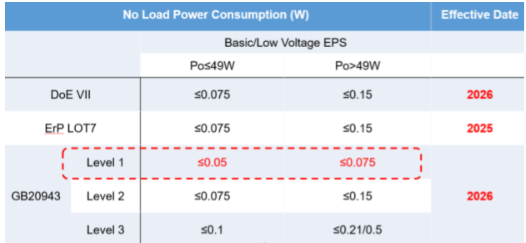 未来,电动汽车、手机充电器、电视、监视器等很多终端设备 90% 以上的时间处于待机状态,待机功耗的减少符合低碳能源的长远路线图。根据新国标 GB20943-2025,Level 1 对应的待机功耗小于 50mW(49W),比之前最严格的 75mW 标准降低了 30% 以上。这一标准的变化意义重大,按照 50mW 待机功耗来计算,40 亿个充电器一年可以省下 14 亿度电。