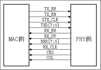 与MII接口相比,GMII的数据宽度由4位变为8位,GMII接口中的控制信号如TX_ER、TX_EN、RX_ER、RX_DV、CRS和COL的作用同MII接口中的一样,发送参考时钟GTX_CLK和接收参考时钟RX_CLK的频率均为125MHz(1000Mbps/8=125MHz)。