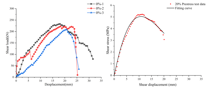 实验内容:本文根据锚杆双剪试验方法设计并开展了不同预应力下GFRP锚杆节理面剪切试验,基于试验结果分析了预应力对GFRP锚杆节理面的失效模式、抗剪承载力、剪切变形的影响,并基于等效应变假定,结合损伤力学理论,建立了GFRP锚杆剪切位移-剪切刚度和剪切位移-剪应力的预测模型。