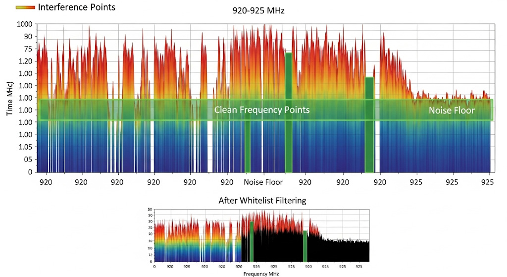 频率白名单:避开脏频;多机做TDM与不同频点错相轮询。