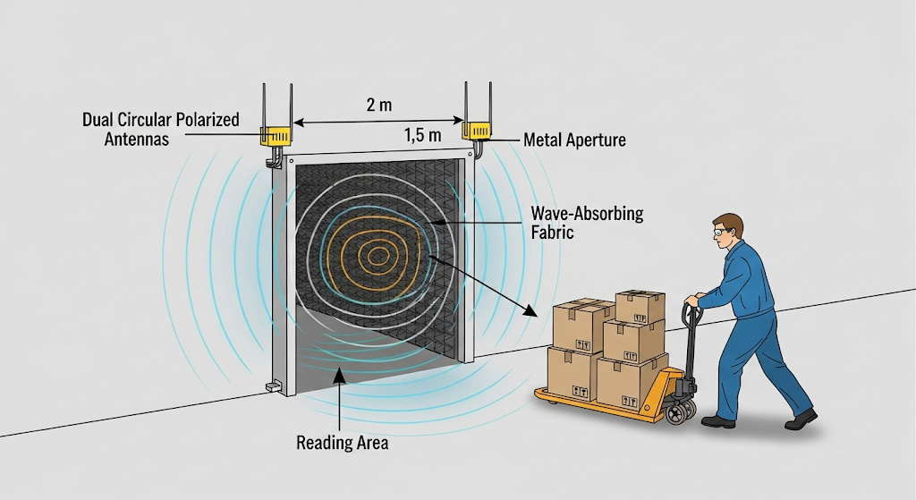 近场优先:工位/RFID隧道机优先近场阵列,进出口做“门帘”。