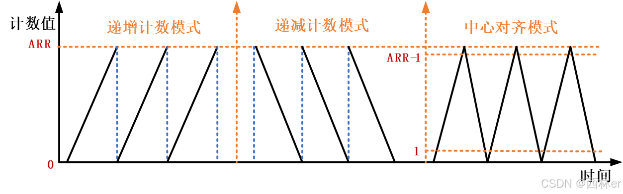 一般情况下,定时器具有3种计数模式:向上计数、向下计数、向上向下双向计数。定时器模块会设置一个自动加载值(ARR)如下图所示。