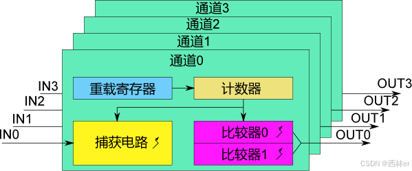 - 通道可同时用于输入捕获以及输出比较