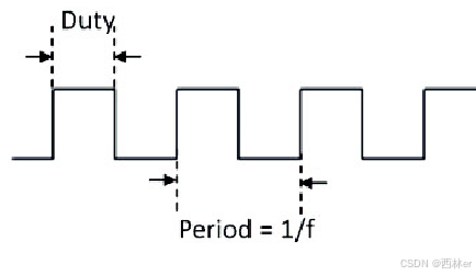 脉冲宽度调制(Pulse Width Modulation,PWM),通过对一系列脉冲的宽度进行调制,在一个设定时间周期内,通过控制输出电平的高低来产生所需要的波形(包含形状以及幅值),进而对目标系统进行开关、能量传递百分比进行控制。