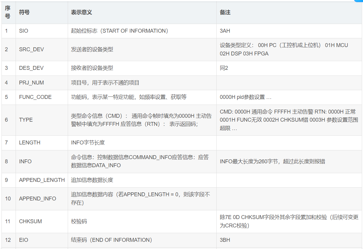 本协议使用十六进制解析,十六进制传输方式。帧结构见表1。字段详细解释见表2。