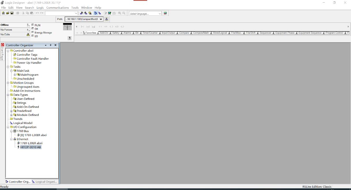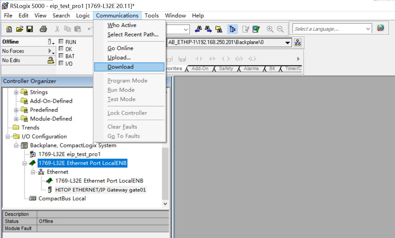 (4)设置工程路径:点击菜单Communications->Who Active,在扫描到的设备中,选择00,CompactLogix Processor,eip选项,点击右下角的Set Project Path。然后点击Close,完成设置。