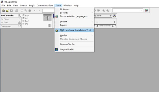 (2)加载EDS文件:运行RSLogix 5000程序,选择菜单“Tools->EDS Hardware Installation Tool”: