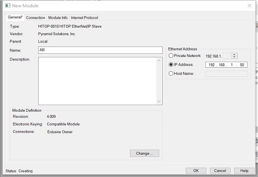 在“Name”中填入网关的名称,在“IP Address”中填入网关的IP地址,点击“Change”设置网关的输入输出数据长度。