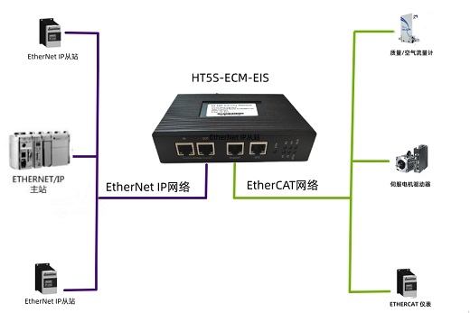 HT5S-ECM-EIS 网关连接到 EtherCAT 总线中作为主站使用,连接到EtherNet/IP 总线中作为从站使用。HT5S-ECM-EIS 网关 EtherNet/IP 侧集成了双端口交换机,可以实现菊花链式的线型拓扑结构, 设备配置和固件更新通过以太网实现。