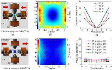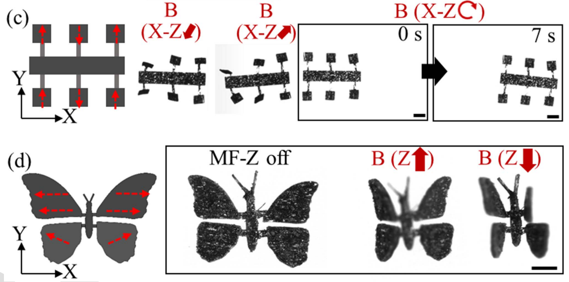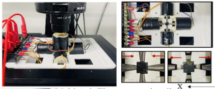实验结果:如附图3所示,通过控制电磁线圈系统中铁芯的位置结合控制放大器控制输入电压强度,可以有效产生梯度磁场和均匀磁场。放大器对上位机信号的快速响应使得电磁线圈系统可以灵活控制磁场模态。附图4是光聚合制造的爬行多足机器人和飞行蝴蝶机器人。在放大器输出的高频信号下,电磁线圈可以快速变化磁场方向,频率和强度,爬行机器人可以实现多足的多方向协同控制实现爬行运动和位姿方向调整。蝴蝶机器人可以实现翅膀的挥动。