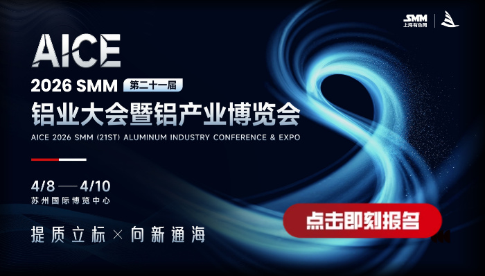 为加强全球铝业产业链的合作交流,2026年4月8-10日,AICE 2026 SMM铝产业博览会将于苏州国际博览中心举办。本届展会以 “提质立标·向新通海”为主题,聚焦全球铝产业链及终端应用领域优质资源,打造集 “技术展示、商贸对接、趋势研讨、资源整合”于一体的专业平台,助力行业提质升级。