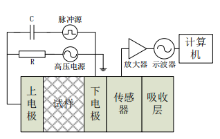 PEA法交变电场空间电荷测试系统的基本原理如图2所示,高压电源提供交变电场,脉冲源提供脉冲激励,交变电场和脉冲电场共同耦合在待测试样上。试样中的空间电荷产生的机械声波被传感器转换为电信号后经放大接入示波器保存,通过检测到的电信号强度和传播到达时间判定空间电荷的电荷量和位置。