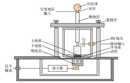 如上图1所示,PEA测试平台包括电极、传感器、放大器等器件。交变电压接入金属丝杆通入上电极,丝杆外包裹绝缘层穿过电极外壳,由于交变电压容易在尖端产生电晕,因此使用均压球优化接口处电场分布。脉冲源在电极侧面的BNC接口处接入,脉冲经电容C0耦合在试样上,电容C0还起到隔绝交变高压、防止对脉冲源造成损害的作用。整个电极通过紧固件固定后与试样紧密接触,在置换试样时可方便地拆卸。上电极与试样间放置一个半导体薄片,用于优化电场分布和吸收试样中向上传播的声波,减少反射声波对测量结果的影响。