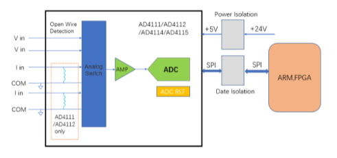 ADI的AD411X是一款集成度高的24位Σ-Δ型ADC,可采集输入 ±10 V的电压和输入0 mA至20 mA。芯片可由5V供电,有开路检测功能。与传统的模拟开关+运放+ADC的方案相比,AD411X可以降低设计复杂度,节省开发时间,有更高采集的精度,免出厂校准。