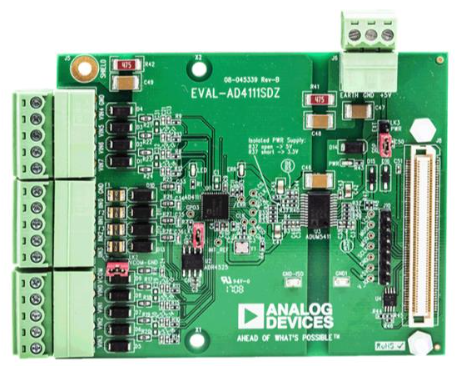 为了让客户更方便的评估AD411X的器件性能,缩短产品的研发时间,ADI提供了评估板。该评估板的输入电压范围为 ±10 V(4 个差分通道或 8 个单端通道),具有断线检测功能,4 个电流通道的工作电流范围为 0 mA 至 20 mA。所有通道都具有板载过压和过流保护。[1] 评估板可通过的SPI接口连接客户的MCU或ARM平台测试。