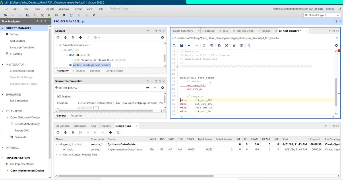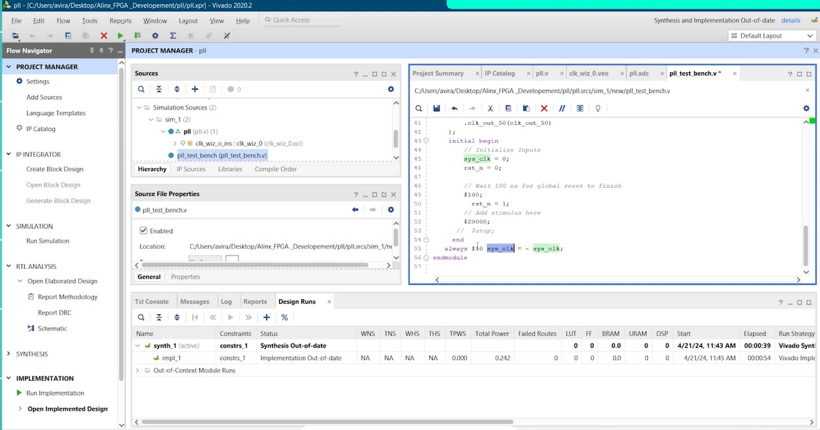2. 创建仿真文件:Add Sources → Add or create simulation sources → Create,将仿真文件命名为“pll_test_bench”,确认后点击“完成”。当前无需添加 IO 端口,直接点击“确定”。3. 双击打开“pll_test_bench”文件,编写测试代码: