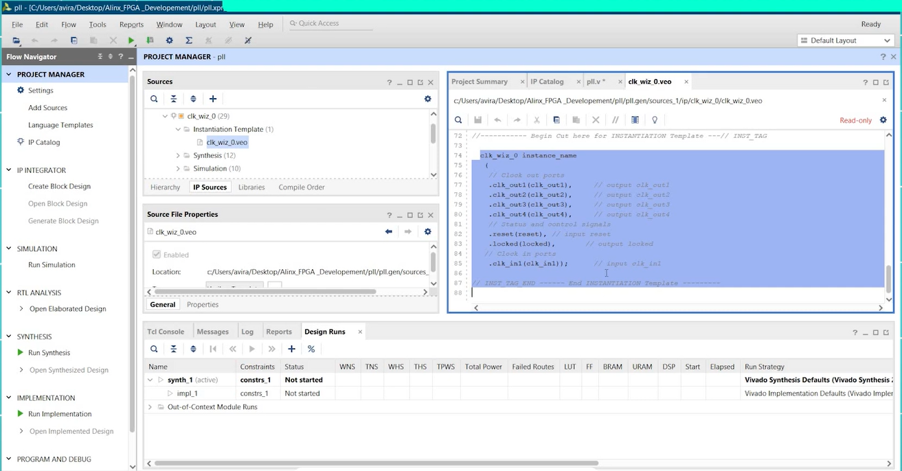 接下来去 IP Sources,打开 PLL IP 核的实例化模板(Instantiation Template),复制模板代码粘贴到顶层文件 ppl.v 中,并把前面定义好的输入输出信号映射进去。