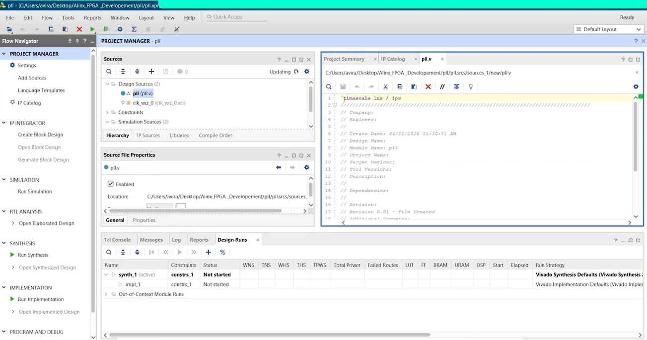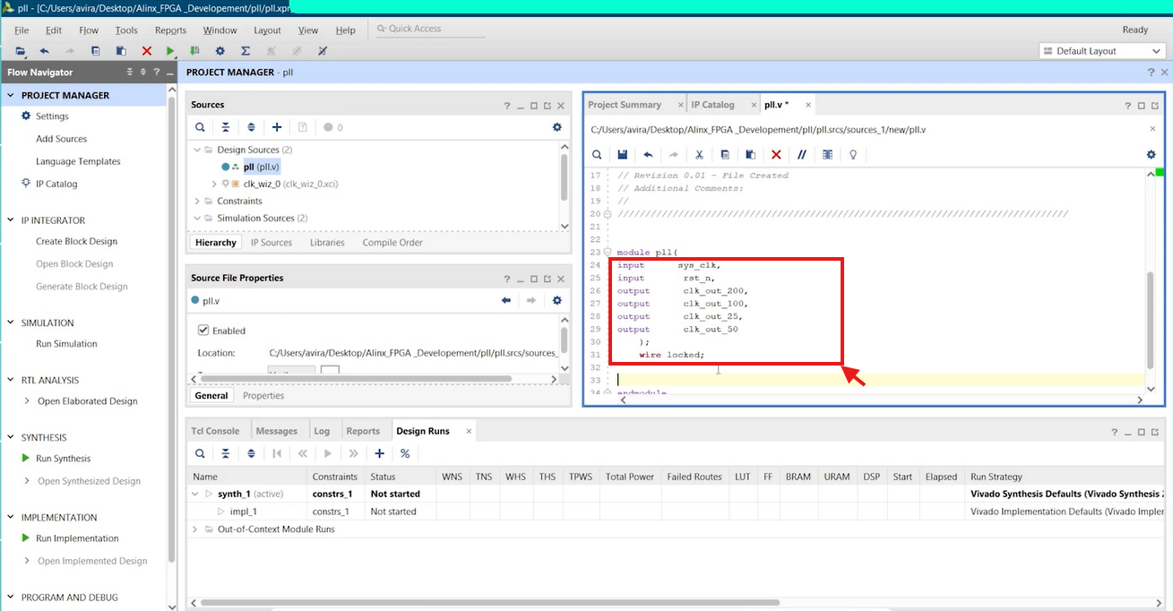 保存后,就能在工程层次结构(Hierarchy)中看到 PLL IP 已成为设计的一部分。