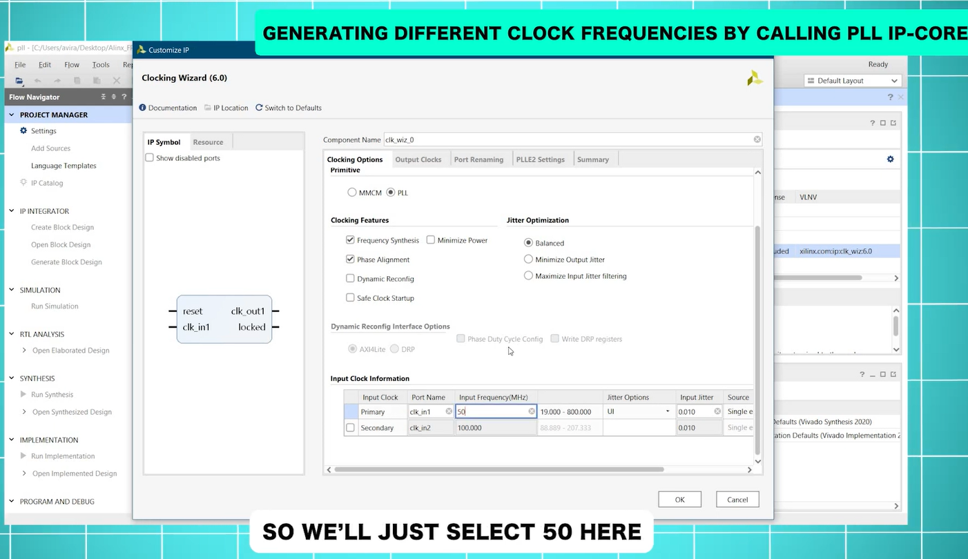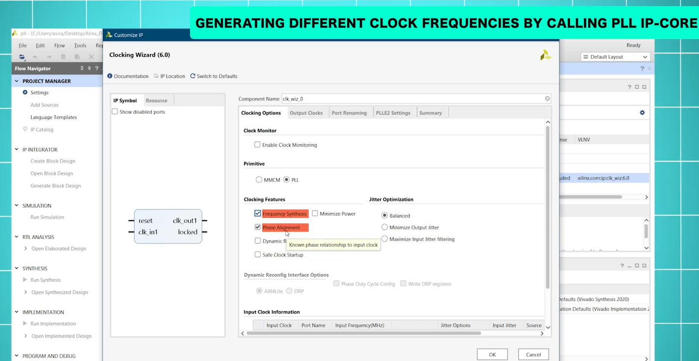 在 Clocking Wizard 配置界面中,选择 PLL 作为时钟生成方式。勾选频率合成(frequency synthesis)和相位对齐(phase alignment)。