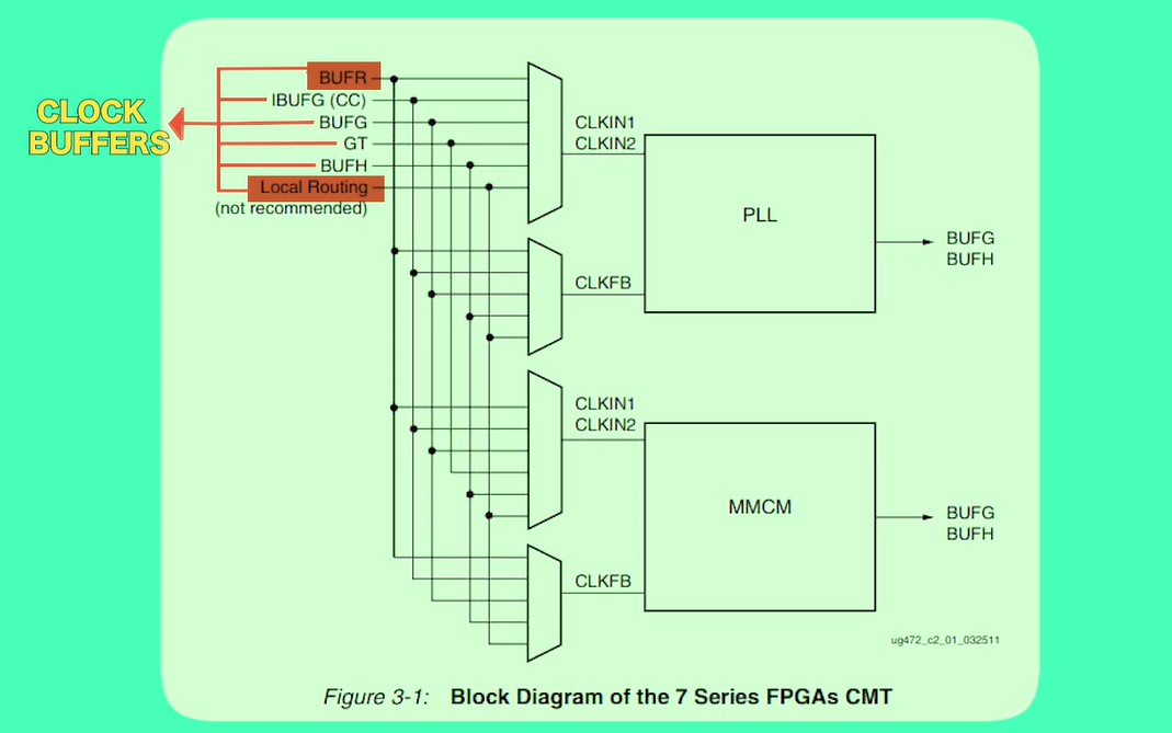 在 Xilinx 7 系列 FPGA 中,芯片内部设计了专用的全局(Global)和区域(Regional)时钟资源,用来处理各种时钟需求。这些资源被称为时钟管理单元(Clock Management Tile, CMT),它们提供: