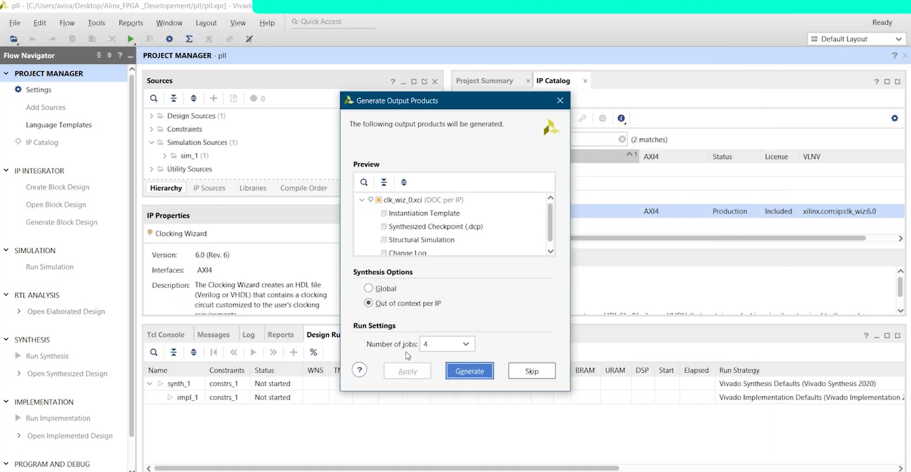 接下来,我会演示如何在 Vivado 中调用 Xilinx 提供的 PLL IP 核,来生成不同的时钟频率。随后我们会把 FPGA 的某个外部引脚配置为时钟输出。先创建一个 Vivado 工程,然后从 IP Catalog(IP 库) 中搜索并添加 PLL IP 核,这里IP核的名称是 Clocking Wizard。双击它,就会打开 IP 自定义窗口,进入参数配置环节。