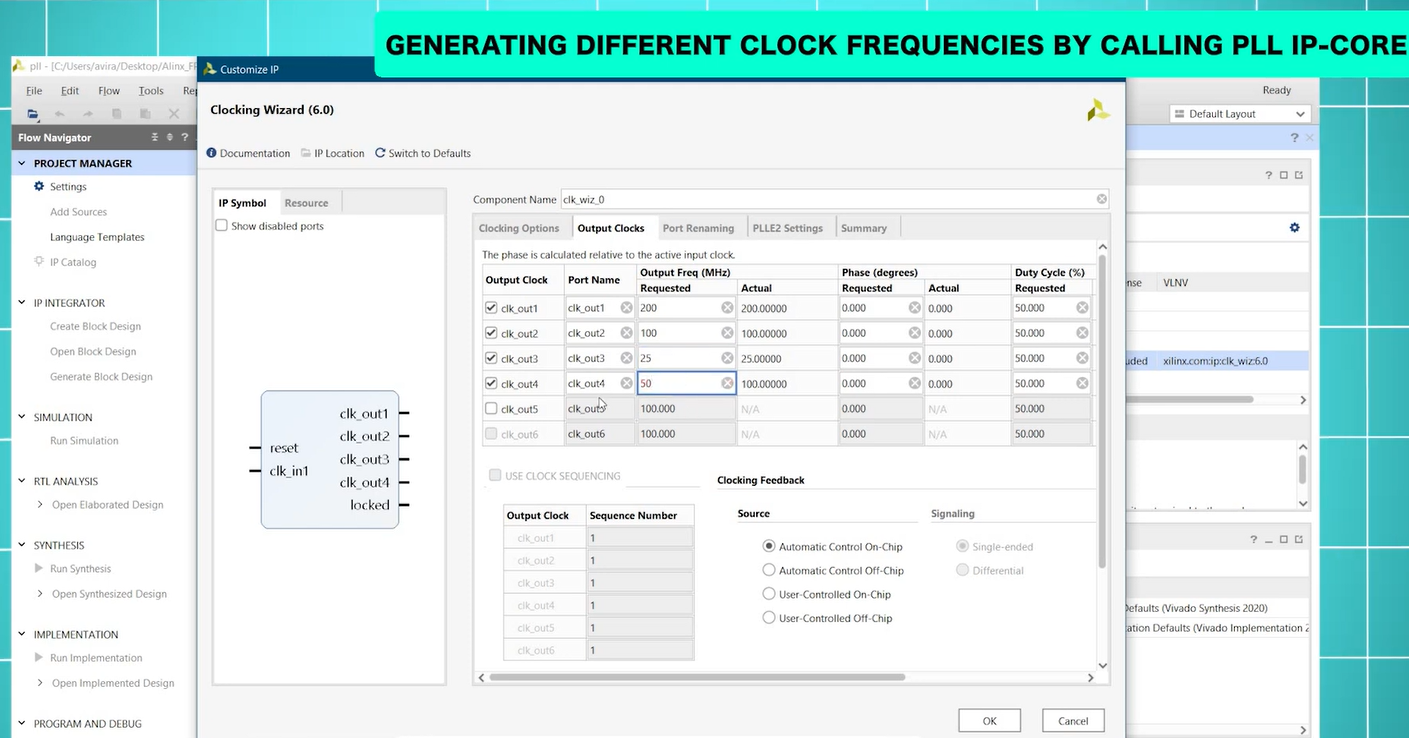 四路时钟输出(clk_out_200、clk_out_100、clk_out_25、clk_out_50):分别代表200 MHz、100 MHz、25 MHz、50 MHz